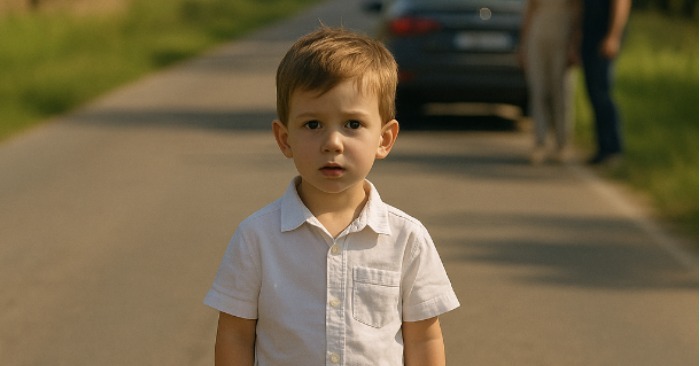 באמצע האספלט, תחת השמש הקופחת, עמד ילד קטן — יחף, בחולצה ובהירה ומכנסיים קצרים. הוא לא בכה, לא זז — רק הסתכל לכיוון המכוניות.